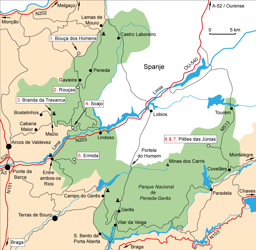 Op de kaart staan de beginpunten van de wandelroutes in het natuurpark Peneda-Gerês: